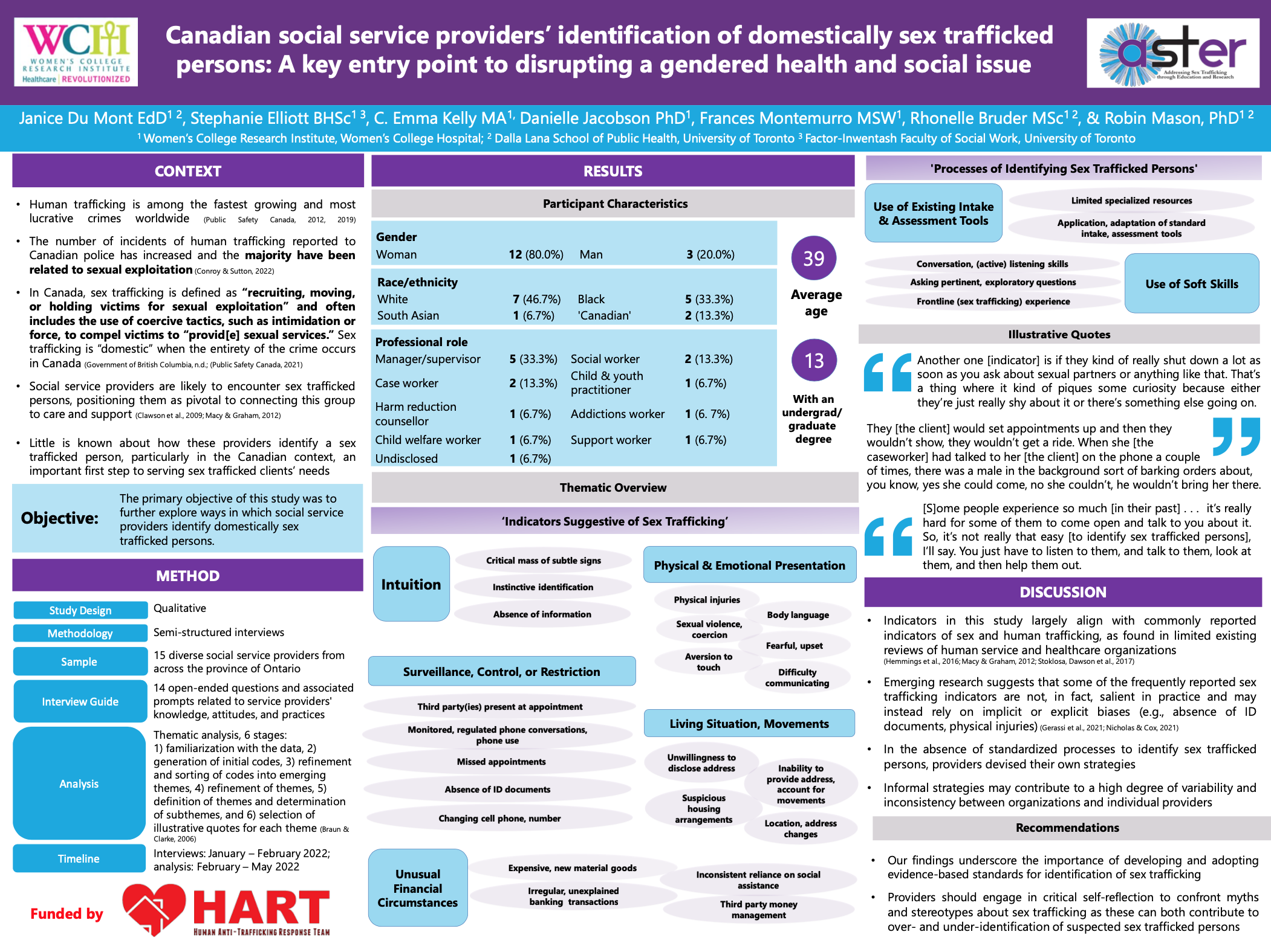 Cite as: Kelly, C.E., Elliott, S., Jacobson, D., Montemurro, F., Bruder, R., Mason, R., & Du Mont, J. (2023, May 8-11). Identifying sex trafficked persons: A qualitative study of social service providers. Poster presented at Women's College Hospital's Day of Excellence in Academics 2023, Toronto, ON.