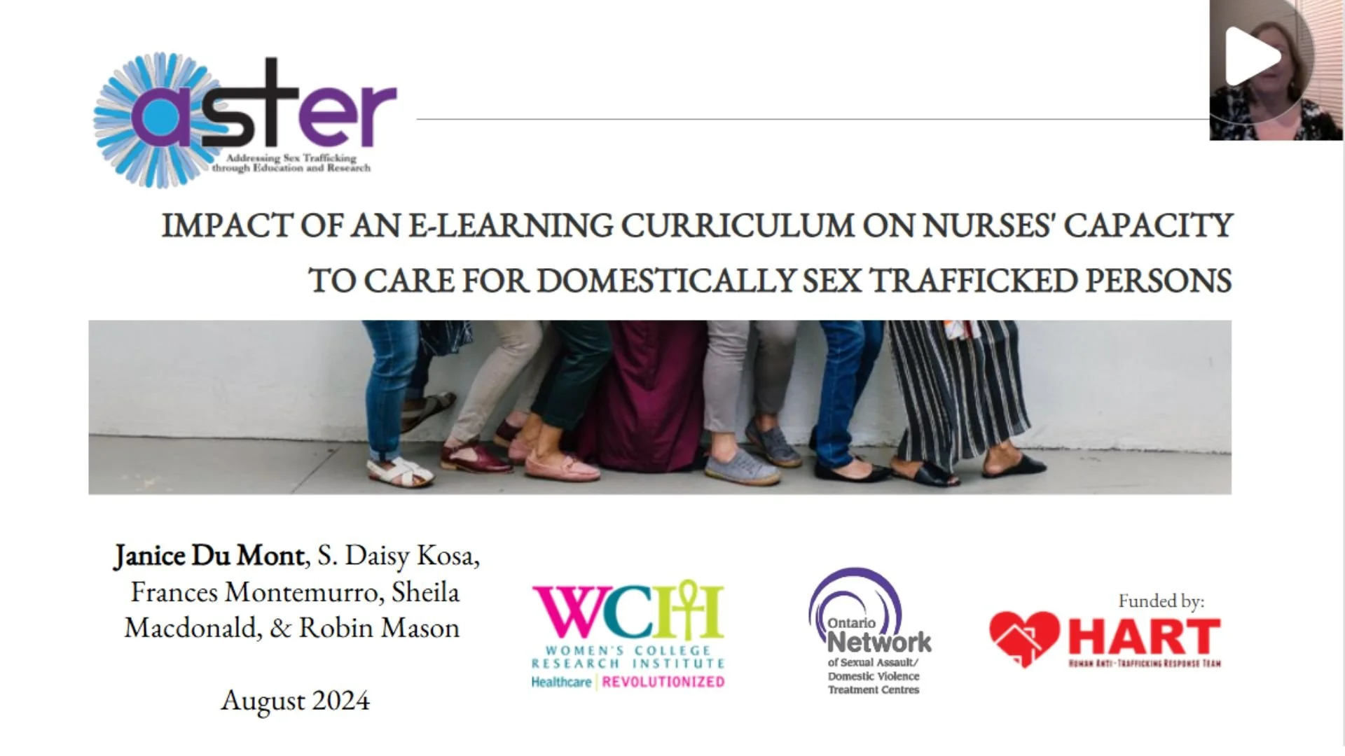Cite as: Du Mont, J., Kosa, S.D., Fan, S., Pereira, R., Mason, R., & Macdonald, S. (2025, April 10). Evaluation of nurses’ capacity to care for domestically sex trafficked persons before and after completing an e-learning curriculum [Poster presentation]. Women’s College Hospital's Day of Excellence in Academics 2025, Women’s College Research Institute, Women’s College Hospital.