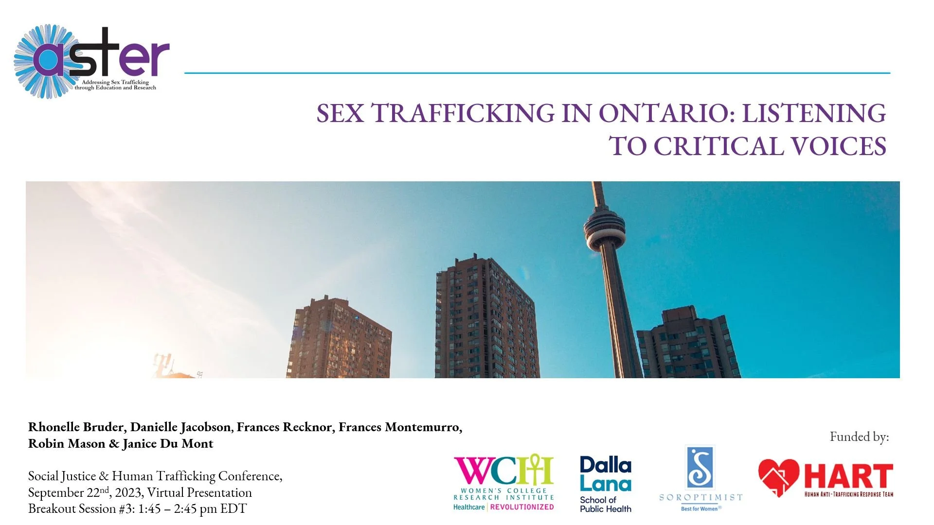 Cite as: Bruder, R., Jacobson, D., Recknor, F., Montemurro, F., Mason, R., & Du Mont, J. (2023, September 20-22). Sex trafficking in Ontario, Canada: Listening to critical voices. Paper presented at International Human Trafficking & Social Justice Conference 2023, Toledo, Ohio, Virtual.