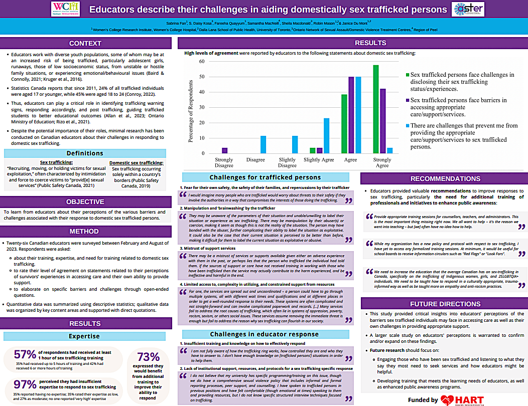 Cite as: Fan, S., Kosa, S.D., Quayyum, F., MacNeill, S., Macdonald, S., Mason, R., & Du Mont, J. (2024, April 18). Police describe the challenges in aiding domestically sex trafficked persons [Poster Presentation]. Women’s College Hospital’s Day of Excellence in Academics, Toronto, ON, Canada.