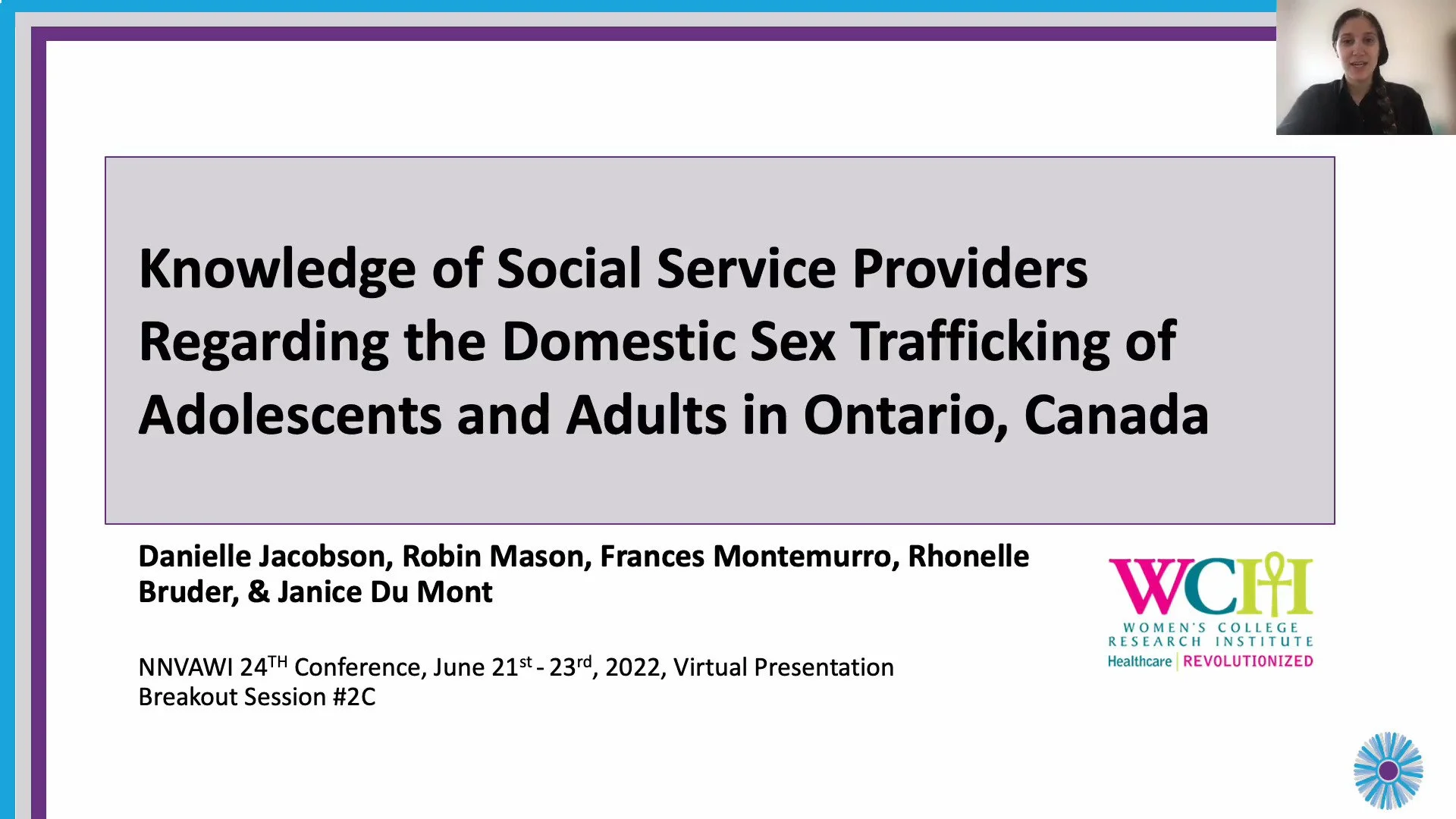 Cite as: Jacobson, D., Mason, R., Montemurro, F., Bruder, R., & Du Mont, J. (2022, June 23). Knowledge of social service providers regarding the domestic sex trafficking of adolescents and adults in Ontario, Canada. Paper presented at the 24th Nursing Network on Violence Against Women International (NNVAWI) Conference, Durham, NC, Virtual.