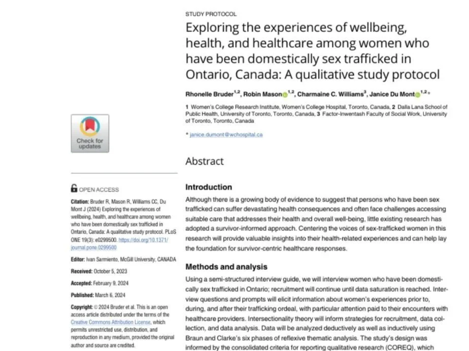 Cite as : Bruder, R., Mason, R., Williams, C., Du Mont, J. (2024). Exploring the experiences of well-being, health, and healthcare among women who have been domestically sex trafficked in Ontario, Canada: A qualitative study protocol. Plos ONE, 19(3):e0299500. https://doi: 10.1371/journal.pone.0299500.