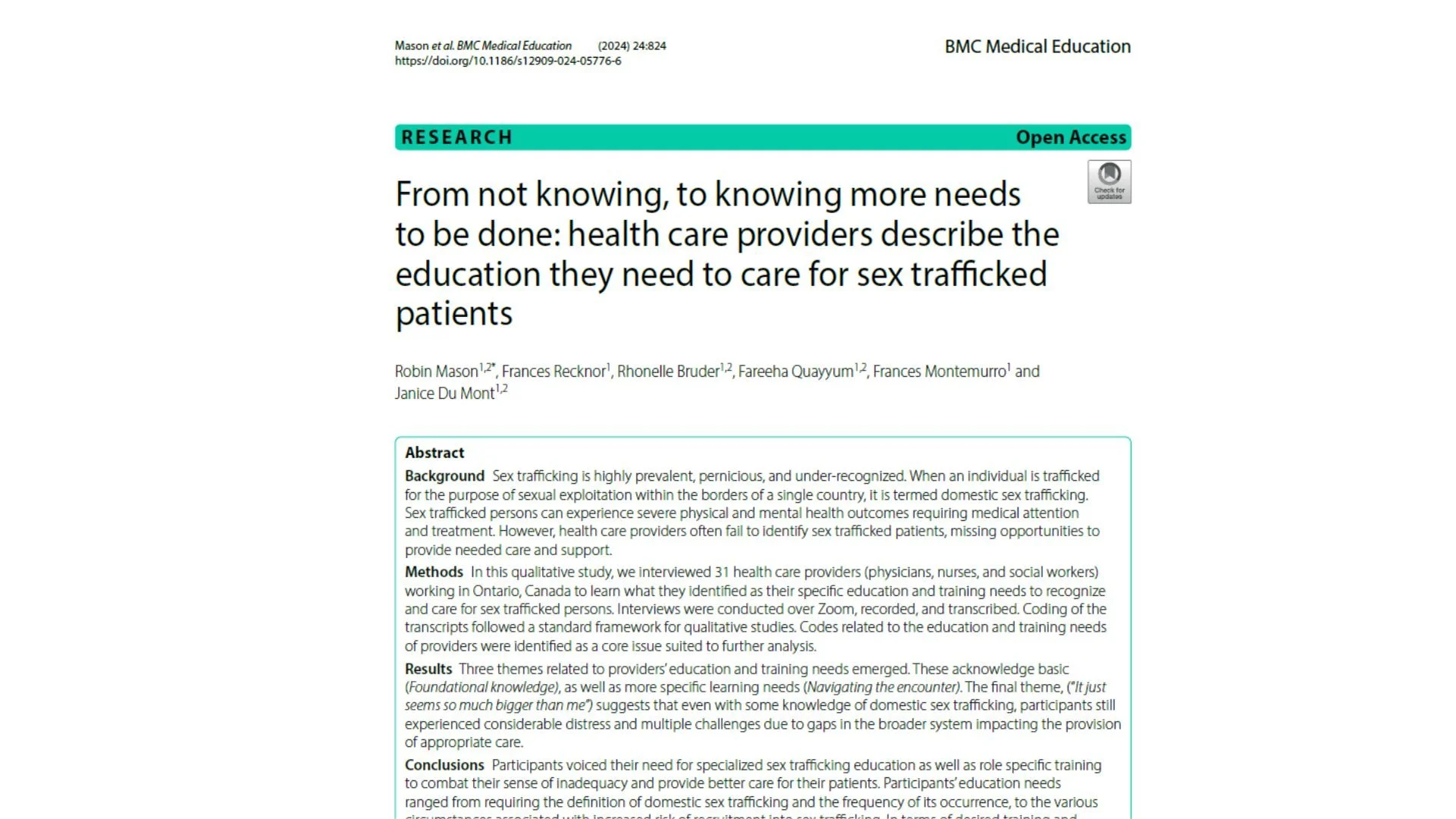 Cite as: Mason, R., Recknor, F., Bruder, R., Quayyum, F., Montemurro, F., & Du Mont, J. (2024). From not knowing, to knowing more needs to be done: Health care providers describe the education they need to care for sex trafficked patients. BMC Medical Education, 24(1), 824. https://doi.org/10.1186/s12909-024-05776-6